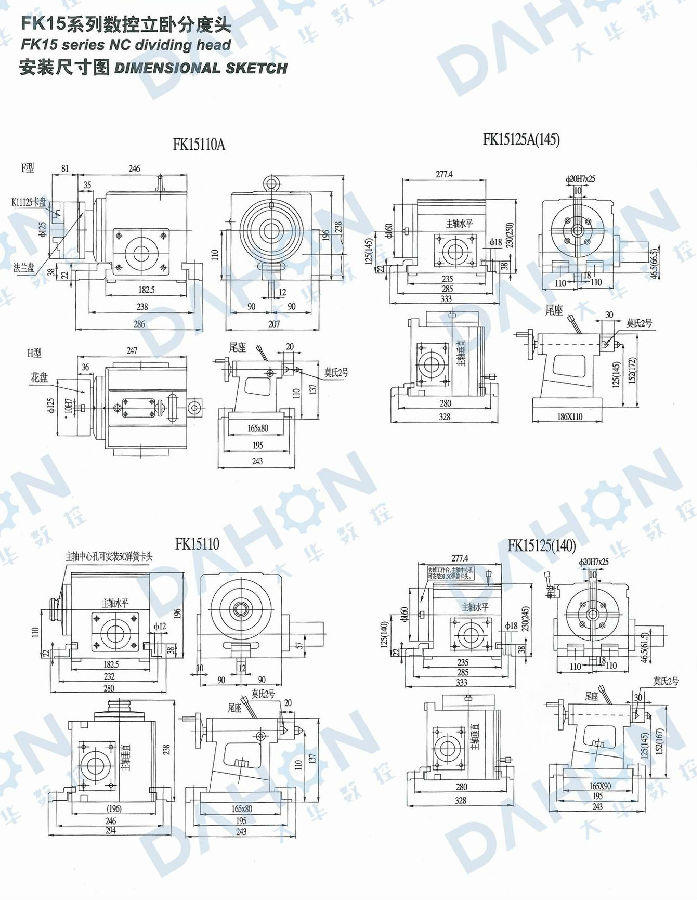 FK15系列數(shù)控立臥分度盤是數(shù)控銑床、加工中心等機(jī)床的主要附件之一,亦可作為半自動(dòng)銑床、鏜床或其他類機(jī)床的主要附件。Connected with the CNC control device or the contro system of the machine and the 4-6 bar pressure air,the NC dividing head can carry out the performance of clamping, unclamping and circular indexing at arbitrary angle for the work-piece.this product can be used vertically and horizontally.