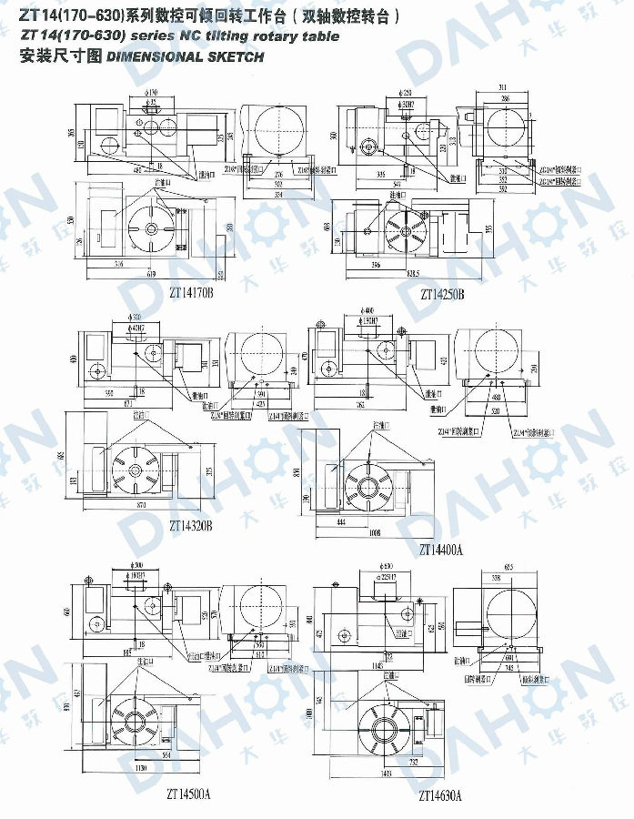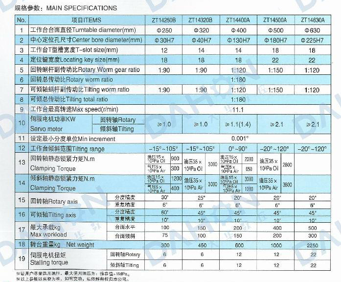 ZT 14 NC rotary table is constructed complete with an NC controllable rotary axis as well as an NC controllabletilting axis,and mainly used with CNC milling machine and machine center,It is controlled either by two-coordinatecontrol system of the main machine or by selfequipped two-coordinate control system.In combination with mainmachine,holes,slots,cam,curving line and surface in any angle position can be carried out precisely.Besides,it can alsobe used in common drilling,milling and boring machines,performing independently equal and unequal divisions.